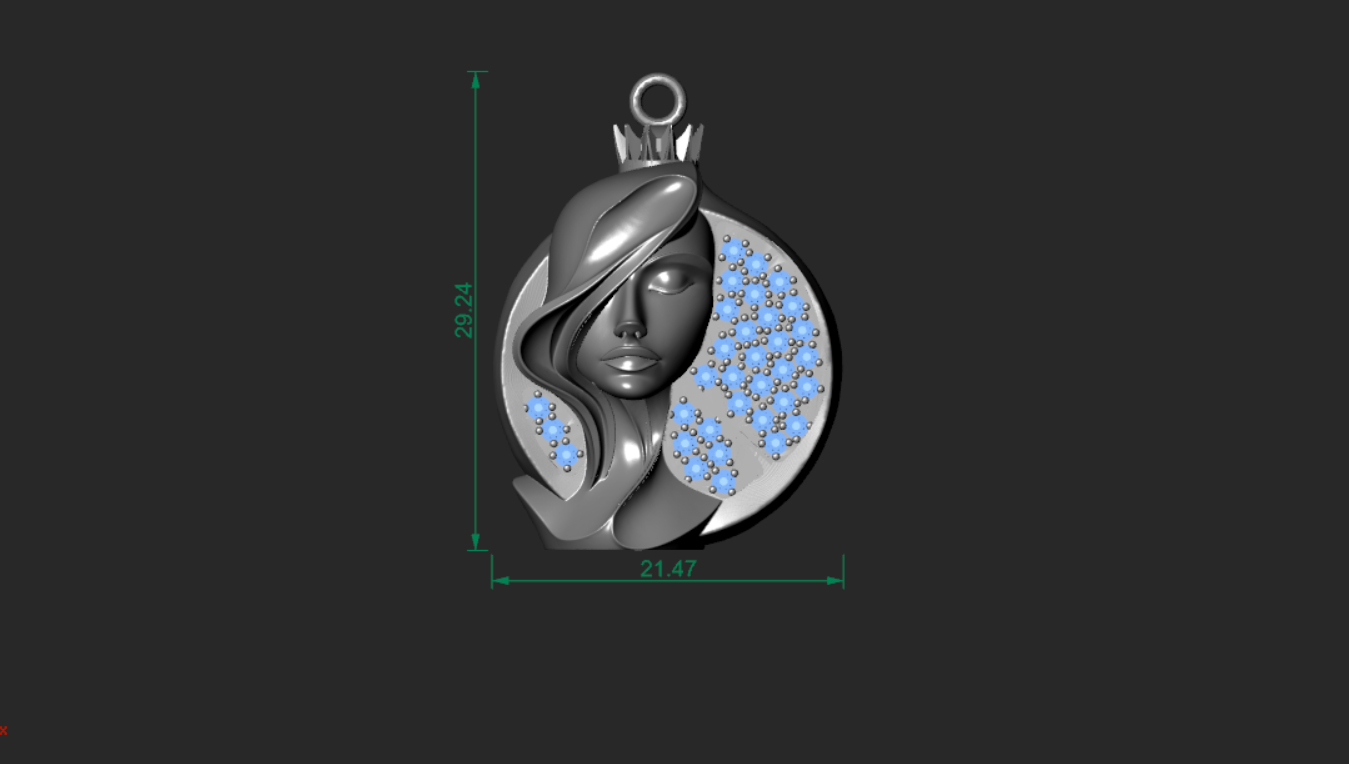 رخ این طرح در نرم افزار زیبراش طراحی شده است که جلوه و زیبایی کار را دو چندان می کند , سنگ های قرمز و دیواره این آویز در نرم افزار ماتریکس طراحی شده است که سنگ های قرمز خود را به دونه های انار تشبیه کرده اند .